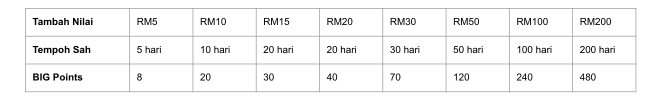 Tempoh sah kredit bergantung kepada tambah nilai kredit. Berikut adalah jadual tempoh sah kredit.